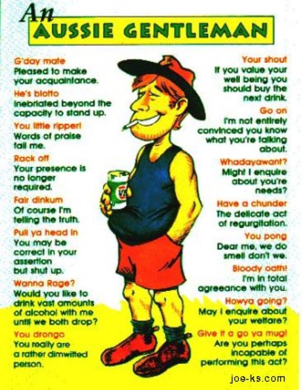 Gelelim kelimelere ve slanglere(slangin Türkçe çevirisi “argo” ama tam olarak öyle diyebilir miyiz bilmiyorum). Onbinlerce kelime ve kelime grubu uydurmuşlar. Avustralya’nın hikayesini az çok bilirsiniz ,James Cook burayı bulduktan sonra 1788’de Britanya hapishaneleri tıka basa dolduğu için mahkumlarını buraya gönderiyor. Söylenene göre mahkumlar anlaşılmamak için şifreli bir dil oluşturuyorlar. Avustralya argosunun ve ilginç kelimelerinin kökenin buna dayandığı söyleniyor.Tabi çok önemli bir etken de bu adamların konuşmaya üşenmesi, her şeyi kısaltması.