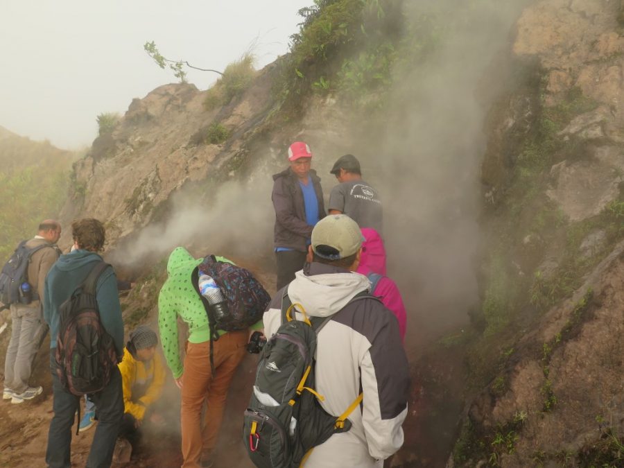 2,5 saatlik yürüşün ardından artık mide alarmlar vermeye başladı, kahvaltı istiyor beden. Rehberimizi yakaladık hemen. Baktık ki dağın kendi volkan sıcağında bize yumurta ve muz pişirmeye başlamış. Normal zamanda hayvansal ürün tüketmeme rağmen o kadar aç olunca ve karnımı doyuracak başka seçeneğim olmayınca ben de yedim yumurtalardan. Aşağıya sağ salim inebilmem için enerjiye ihtiyacım vardı. Seyahat halindeyken bazen yemek konusunda tercih yapabilme lüksün olmayabiliyor ne yazık ki.