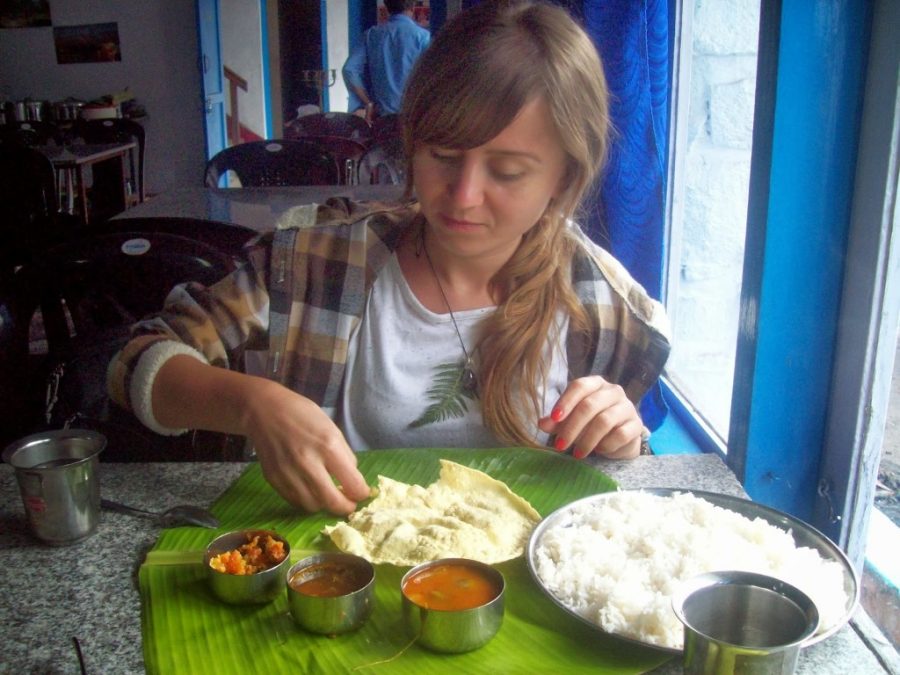 Yemekler muz ağacı yapraklarında geliyor, çatal kaşık yerine ellerinizi kullanıyorsunuz. En lezzetli yemek böyle oluyor 🙂