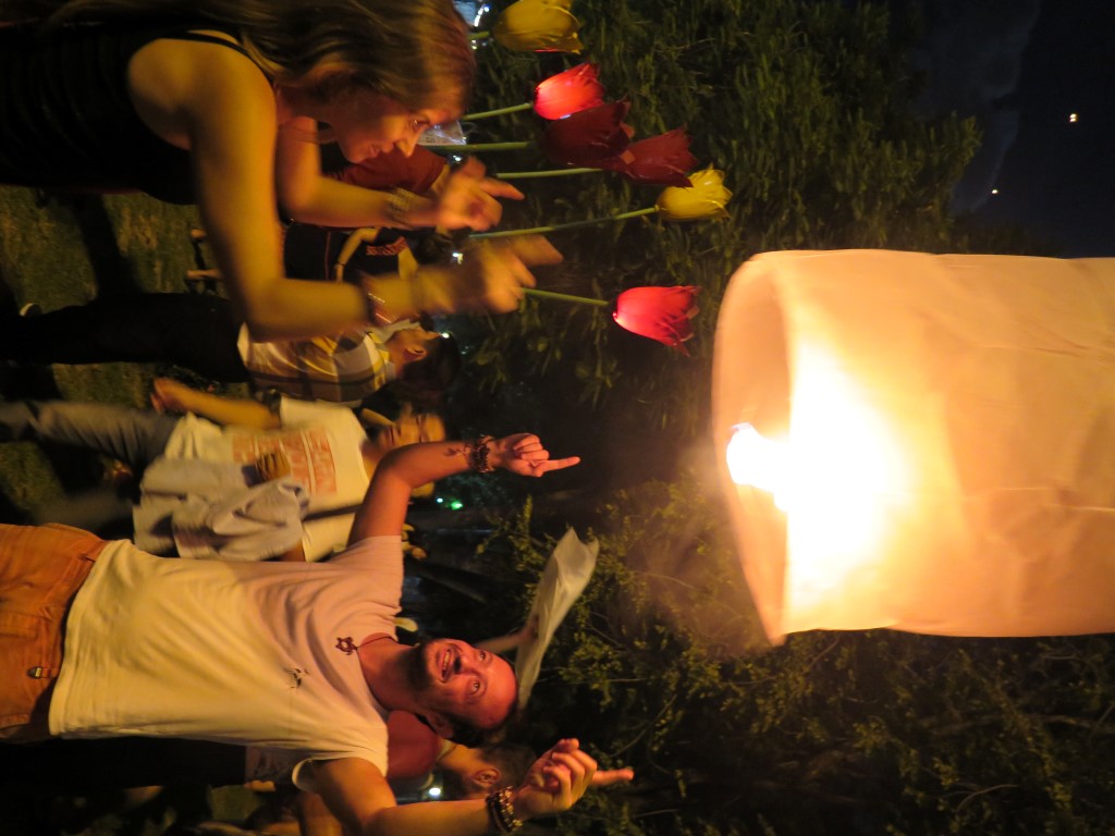 Bilgilendirmeden sonra hikayeye dönecek olursak; Müge ve Noah ile tekrar buluştuk. 6 kişiyiz. Bir elimizde fenerler bir elimizde gündüz hostelde kendi ellerimizle yaptığımız sepetlerle kalabalığın içerisinde ilerlemeye çalışıyoruz. Bir yandan ara ara fotoğraf çekmeye çalışırken bir yandan birbirimizi kaybetmemek için yoğun çaba harcıyoruz. Sağda solda havaya atılan fenerlerin bazıları yere düşüyor, bazılarını ağaçlara takılmış bir halde görüyoruz. Ulan saçım başım yanmasın korkusuyla tırsa tırsa ilerliyorum. Neyse ki en sonunda fenerleri havaya bırakabileceğimiz bir alan buluyoruz. Hepimizin suratında gülümseme, fenerleri saldıktan sonra sırıta sırıta bakıyoruz dileklerimizin yükselişine. Bir neşe kaplıyor suratlarımızı.