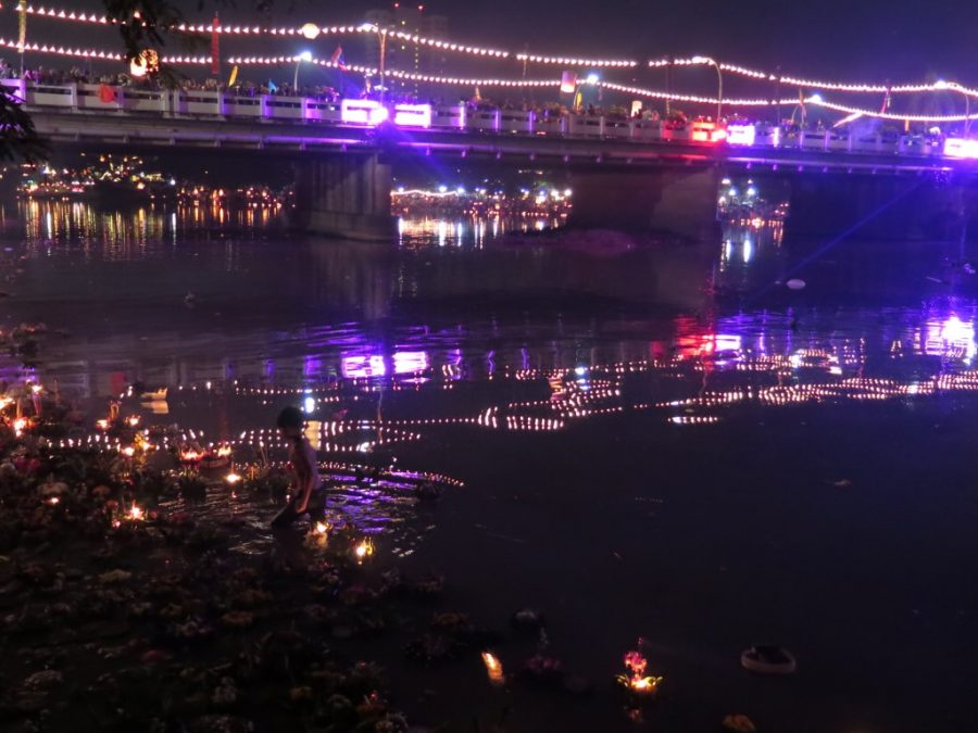 Rüzgarın engellemelerine rağmen sonunda sepetimdeki mumu yakmayı başarıyorum. Ama adam elimden alırken mum sönüyor ve sönmüş vaziyette gidiyor nehre doğru 🙁 Bundan dileğimin gerçekleşmeyeceği sonucunu çıkarıp üzülmeye başlıyorum. Şaka değil bayağı bayağı üzülüyorum. Nehrin kenarına oturup nehirdeki ve gökteki binlerce ışıltıyı izliyoruz uzuuun uzuun. Sonra havai fişek gösterisi başlıyor, ışıl ışıl rengarenk bir dolunay akşamı yaşıyoruz. Tabi ertesi gün bu kirliliğin nasıl temizleneceği de merak konusu…