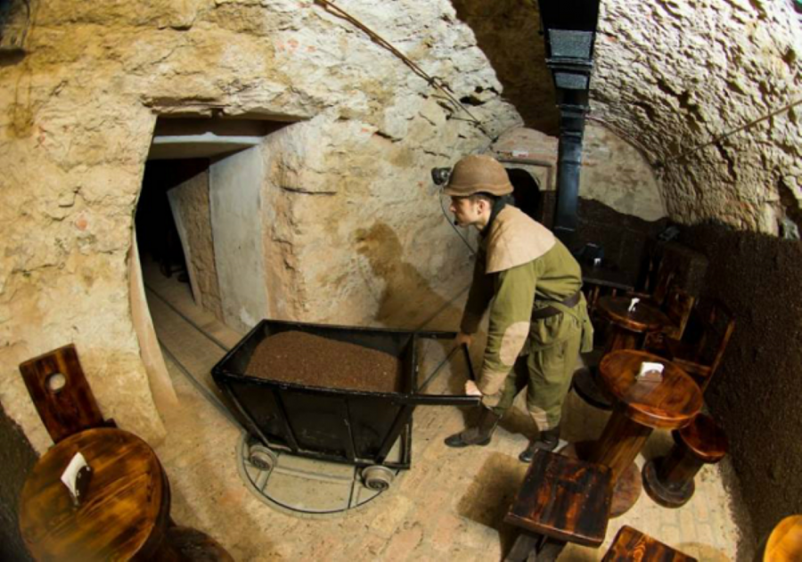 Kafenin bir alt kısmı bir de bahçesi var. Alt kısmına inerken size baretler veriyorlar ve bir madene iniyorsunuz. Konsept gereği kahve çıkaran maden işçileri heykellerinin olduğu bir kahve madeni içinde yürüyorsunuz.