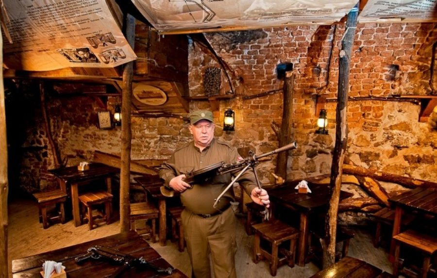 Duvarları askeri donanımlar ve asker portreleri süslüyor. Yemek orijinal ordu tabaklarında sunuluyor. Atmosfer Ukrayna’nın eski günlerine sizi götürüyor.