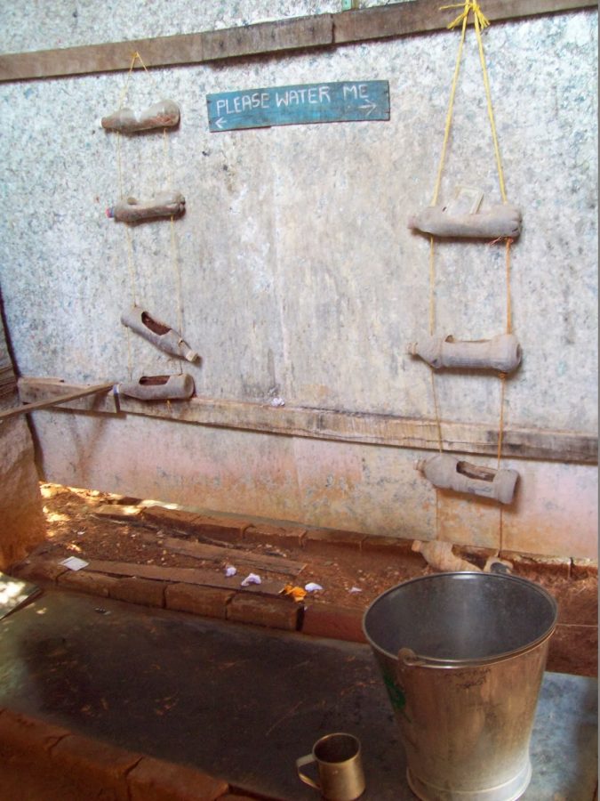 Ellerimizi yıkadığımız muslukları aşağıda görüyorsunuz. Musluk yok aslında, altı delinmiş bir kaba kovadan su alıp koyunca musluk oluyor. Böylece fazla su harcamadan ellerimizi güzelce temizleyebilmiş oluyoruz: