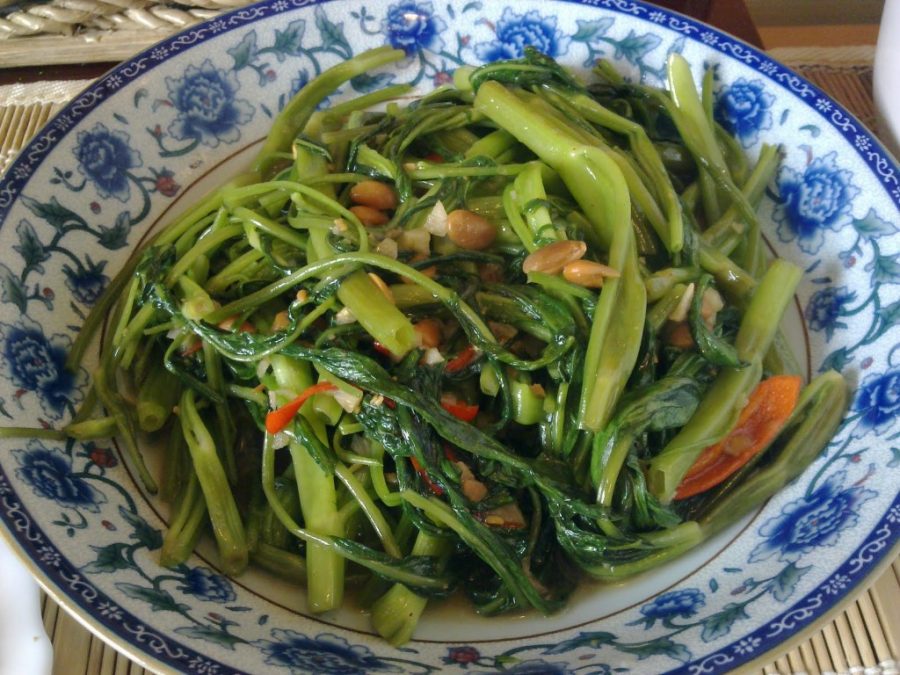 Bir çeşit taze fasulye, börülce gibi sanki, ya da yok tam olarak öyle de değil, ıspanak gibi sanki, ya da bilmiyorum değişik bir şey:) Türkçe çevirisi tarla sarmaşığı falan diyor ama pek doğru çevirisi olduğunu sanmıyorum çünkü bizde yetişen bir sebze değil. Bu sebzeyi soya soyu, sarımsak ve baharatlarla karıştırıyorlar, tuzlu, baharatlı, ekşi leziz mi leziz bir tat çıkıyor ortaya.